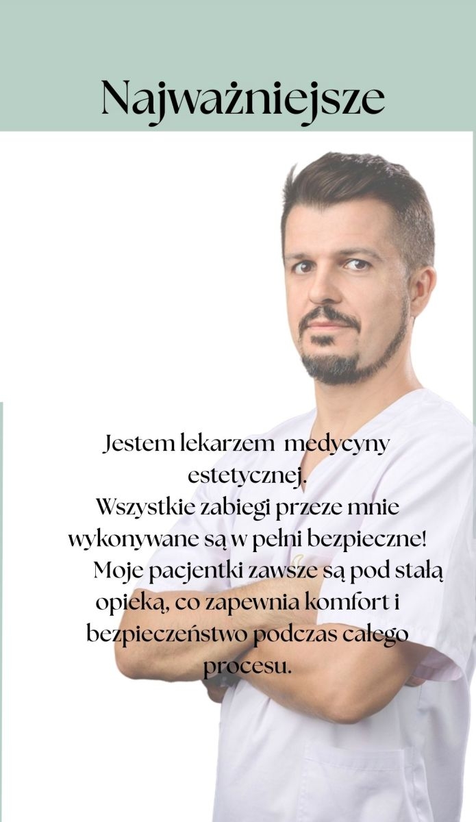 Jestem lekarzem z kilkunastoletnim doświadczeniem klinicznym. Ukończyłem studia podyplomowe z zakresu medycyny estetycznej w Warszawie, gdzie zdobywałem specjalistyczną wiedzę i praktyczne umiejętności pod okiem uznanych ekspertów. Solidne wykształcenie medyczne oraz wieloletnia praktyka pozwalają mi łączyć bezpieczeństwo procedur z estetyką i naturalnością efektów.